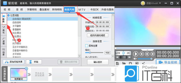 3、点击 自由旋转画面特效 ,点击添加风格效果,选择指定时间段添加风格,如图所示。