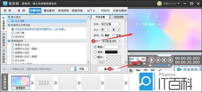 4、设置字幕特效参数,点击播放试试, 检验字幕特效效果 ,如图所示。