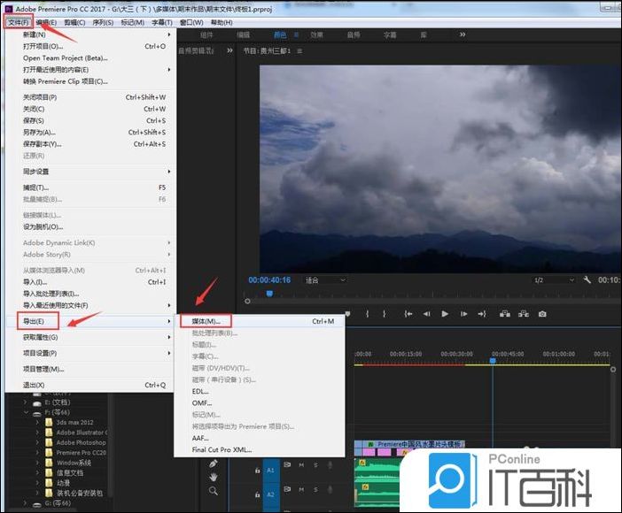 2、按住Ctrl+M弹出导出面板,或者可以直接点击“ 文件 ”,找到“ 导出 ”,然后选择“ 媒体 ”