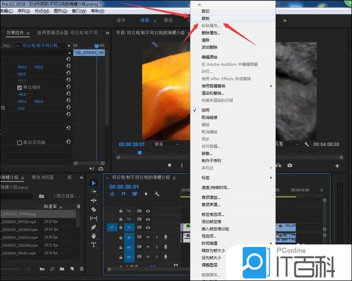 4、调整好一段视频素材后,右键,在最上面找到 复制 。点击复制后,回到时间轴上, 选中要批量调整曝光的素材片段 ,看我图片的箭头吧,