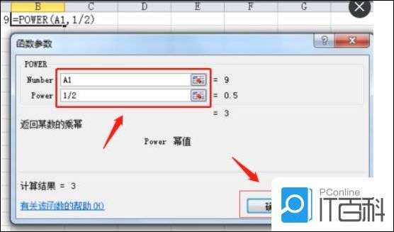 3、在函数第一个框中选择要开根的单元格,第二个方框中输入1/2,点击“确定”按钮。