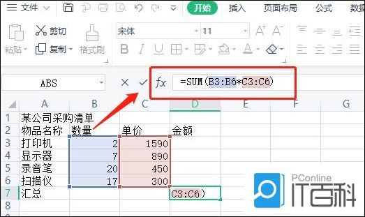 2.选定单元格,在D7单元格里输入=sum(B3:B6*C3:C6)。