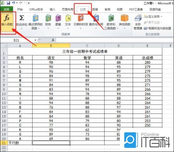 3.将光标放在B21单元格内,点击菜单栏上边的【公式】-【插入函数】按钮,如下图所示: