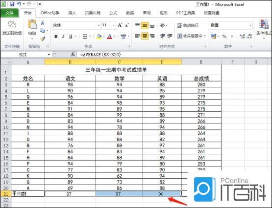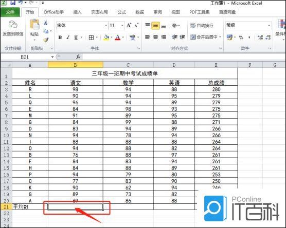 2.现在想要求出每科的平均数,现以语文为例,把平均成绩放在B21单元格,如下图所示:
