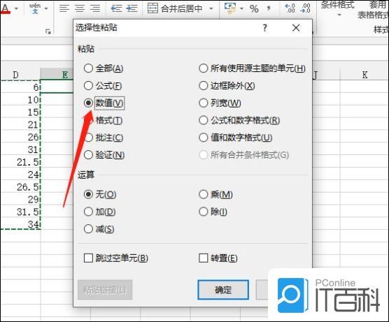 5、在“选择性粘贴”中,选择“数值”,点击确定按钮。