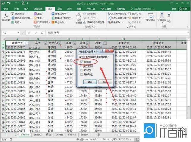 4、在弹出的界面中只选中【首行】,确定后在名称框中就可以看到下拉中有表格列名称了。
