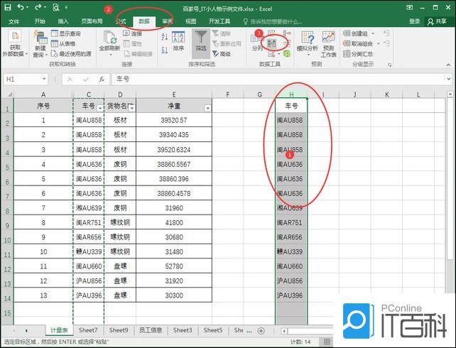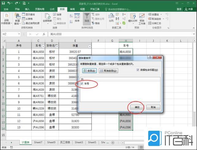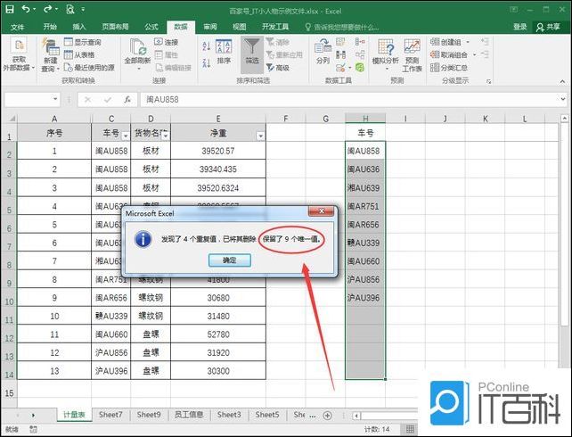 1、以下图中的表格数据为例,介绍如何统计车号列中不重复车号的个数;