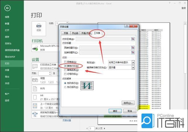 4、在打开的“页面设置”界面中,点击【工作表】,将【单色打印】打上勾,并确定;