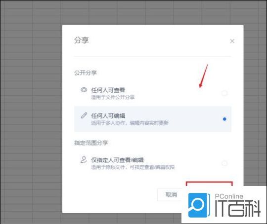 在分享对话框中,可以设置表格的权限,再点击创建并分享按钮即可。