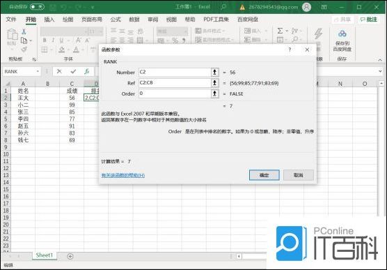 看好数据(如图成绩在C2-C8),然后输入第一个参数我们填C2,第二个参数则要选择所有数据(如图形式填写),第三则是顺序,0为降序,为是升序。(这里为成绩所以选降序。)
