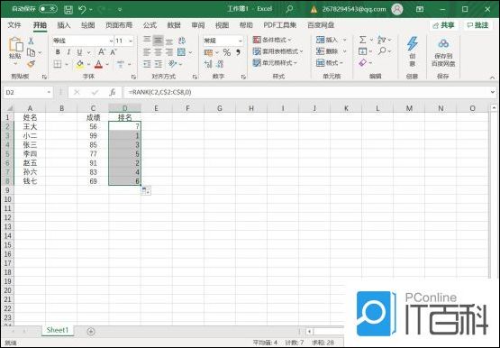 3.最后再下拉数据即可。这样便完成了对excel数据的排名。