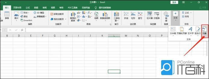2、接下来,在【插入】的工具栏中找到【文本】的选项卡;然后,点击文本下面的小三角,找到【对象】的按钮。(如图所示)