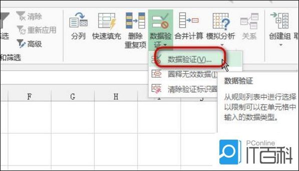 6.在弹出的选择框中选择“数据验证”选项,如图所示。注:也可以通过这里进行单元格内容的指定设置。