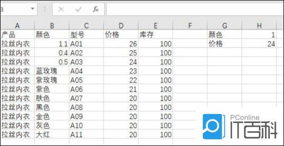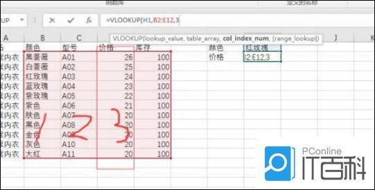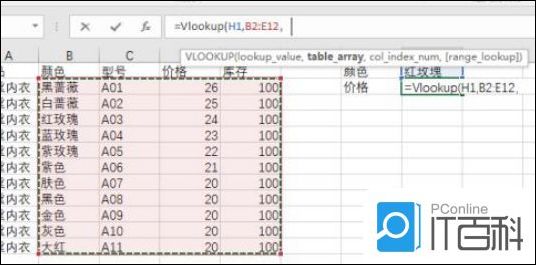 现在是要根据颜色返回价格,那颜色为第一个,价格要包含进入,可以作为最后一列 =Vlookup(H1,B2:E12,返回区域列数,精准还是近似)。