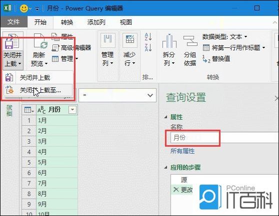 接下来将月数据添加到数据查询编辑器中,并将连接命名为“月份”。默认情况下,导入的月份将被识别为日期,因此我们需要将其设置为文本格式。最后点击“开始”→“关闭并上传到”,选择“仅创建连接”。