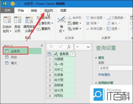 单击业务员表并单击添加列。用户定义的列公式是=1