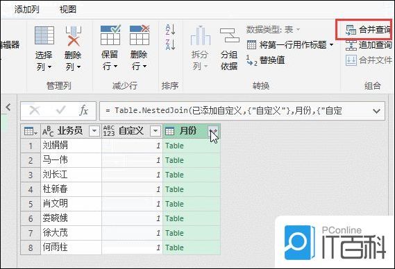 在“业务员”表单中,单击“开始”标签下的“合并查询”,并按照以下步骤操作。