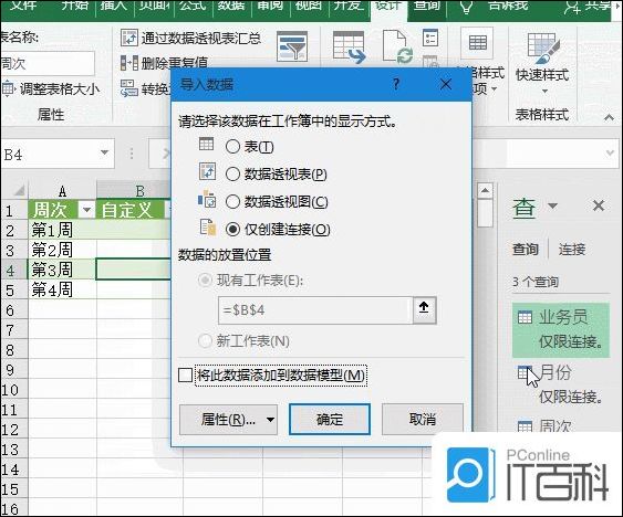 最后,单击“开始”选项卡下的“关闭并上传”,返回到Excel工作表。右键单击连接窗格中的“业务员”→“加载到”,在导入数据对话框中选择“表”,选择一个新的工作表作为存储位置。