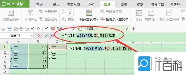 11、后在上方的函数框中输入“=SUMIF(A$1:A$5,C1,B$1:B$5)”。其中A1、A5代表要被合并同类项的字符串所在单元格的范围,B1.B5代表要被求和的数据所在单元格的范围,C1代表目前要被求和的数据所对应的字符串。