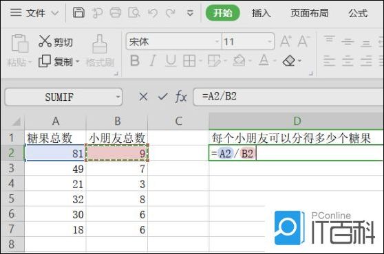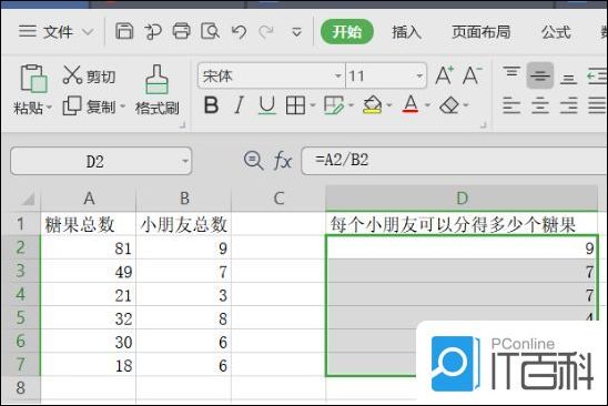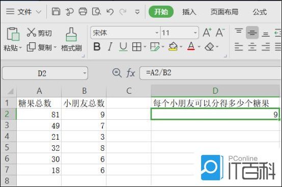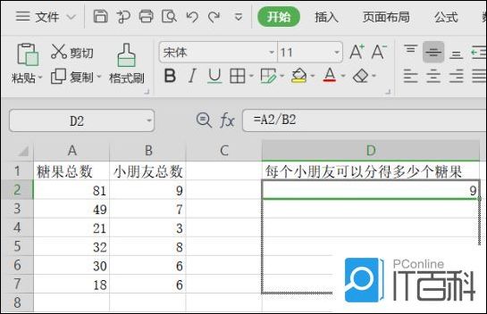 1.首先,将需要计算的表格打开,输入被除数和除数,如下图所示。这里以小朋友分糖果举例,求每个小朋友可以分到多少糖果,计算方法是糖果总数除以小朋友总数。
