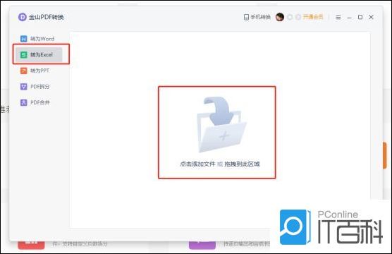 4.转入pdf转excel界面后,点击中间的添加文件或把需要转换的文件拖拽到中间区域。如图所示。