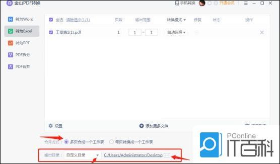 6.打开后。选择合并方式是多页合成一个工作表或每页转换成一个工作表。选择好输出目录。点击开始转换。如图所示。