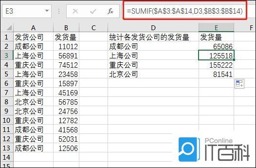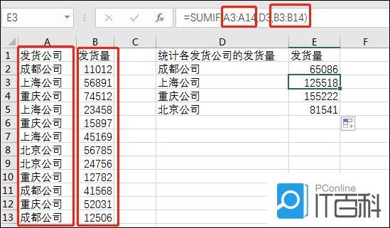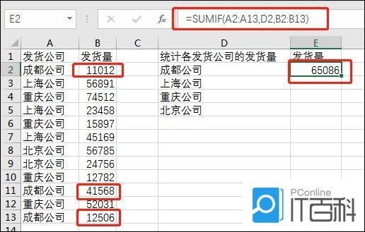 3.sumif函数案列。在A列中的众多发货平台(条件区域)中找出各个发货平台(求和条件)的发货总量(实际求和条件)。输入公式=SUMIF(A2:A13,D2,B2:B13)。公式说明,指定求和条件为成都发货平台,然后再众多发货平台(条件区域)中计算出成都发货平台的总发货量(求和区域)。如图所示。