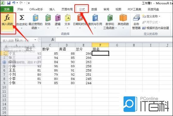 3.这时候,使用函数rank,点击菜单栏上【公式】-【插入函数】按钮,如下图红色圈出部分所示:
