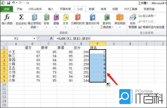 6.最后,求出了F2单元格的结果,选中单元格,右下角会出现【+】,按住鼠标左键,向下拖拽,就可以把所有的成绩填充名次了,如下图所示: