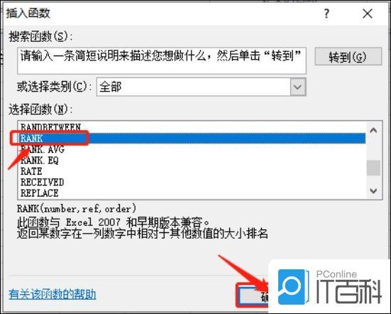 4.在弹出的弹框中找到RANK函数,再点击【确定】按钮,如下图红色圈出部分所示: