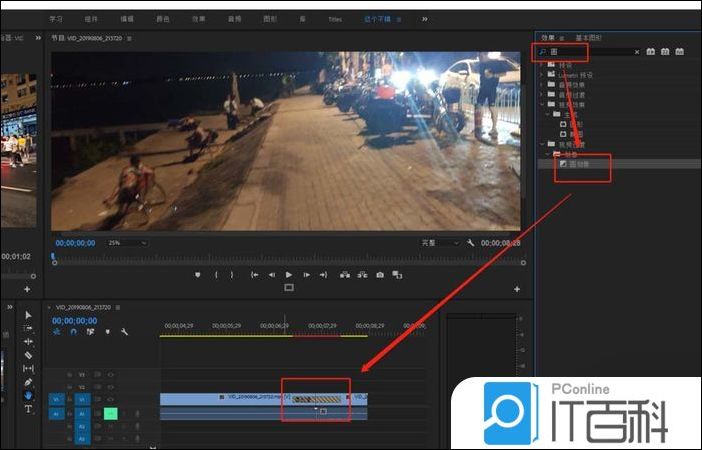 3、搜索PR视频过渡效果,找到PR中的“ 圆划像 ”视频过渡转场,将这个圆划像效果应用到两个视频之间。