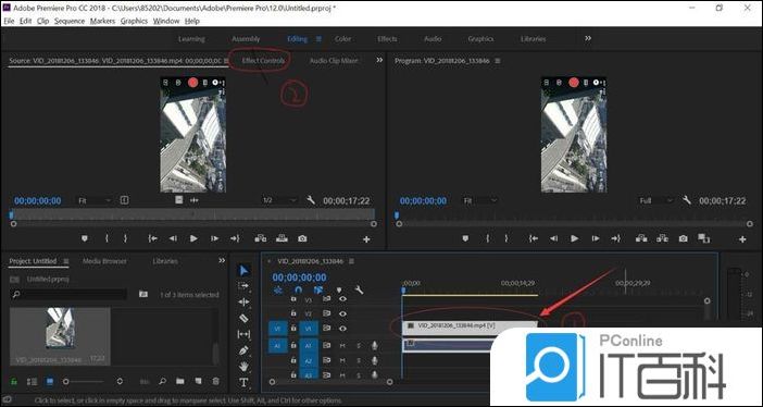 4、双击时间轴框中的视频文件名,再在源文件方框中点击 效果控制标签页 , 切换到视频的效果控制页面