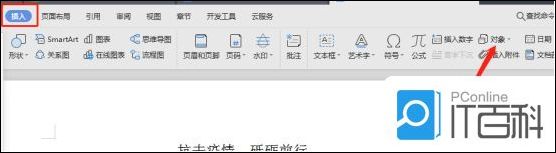 第一步在电脑上打开word文档,点击插入,进去插入界面之后,点击对象,通过插入一个对象来实现将另一个word文件插入到文档中,如下图所示: