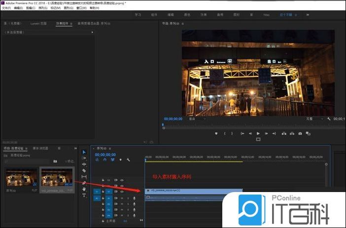 2、在PR项目中导入要进行编辑处理的素材文件,将素材文件放到序列的视频轨道中。