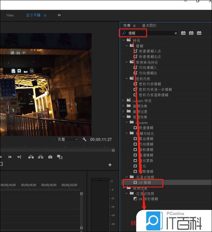 4、在效果窗口中搜索模糊效果,会出现很多跟 模糊有关的效果 ,这里注意要选择视频效果中的 VR模糊效果。