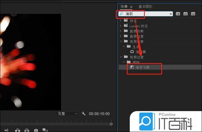 4、勾选了效果窗口之后,可以切换到效果窗口,输入关键字进行搜索,找到“ 油漆飞溅 ”视频过渡效果。