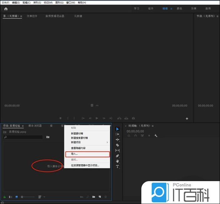 3、进入项目后,在左下角“ 导入媒体 **”这里单击右键,选择导入事先准备好的视频,导入后,并拖到右边的时间轴编辑框,如图