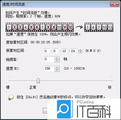 2、如果选择“ 变速 ”,在弹出的对话框中,拉动滑块向快的方向即右侧滑动,然后自己把握好速度即可。