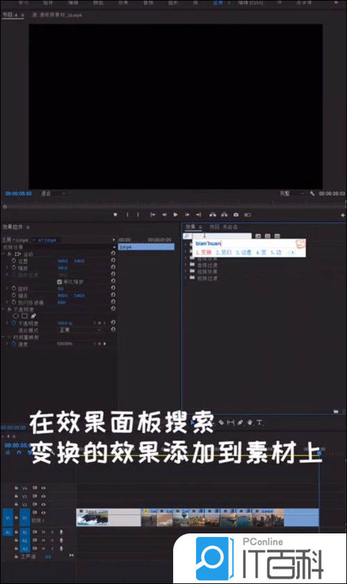 1、在效果面板搜索变换的效果添加到素材上。