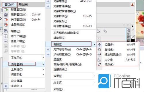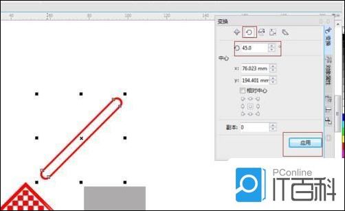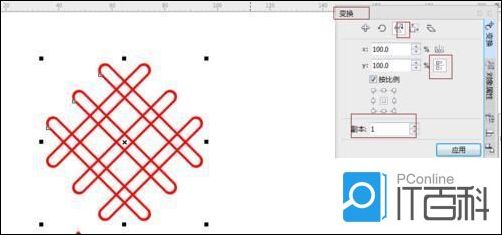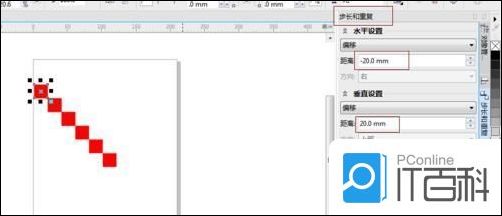 3、打开【窗口】-->泊坞窗-->变换(alt+F7)-->位置-->x:-20mm ;y-->垂直:20mm;方法①原地复制,ctrl+c,ctrl+v。然后点击运用。方法②点击【步长和重复】属性宽设置。份数看需求点击应用,一样可以复制。这里我们复制六个,总共七个。点群组
