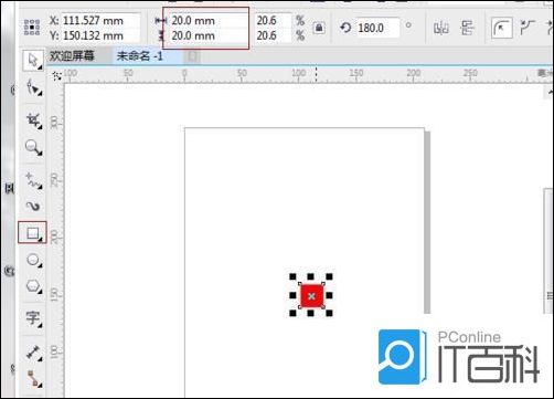 2、按住ctrl键,绘制一个正方形。长宽20,填充红色,去掉边框。