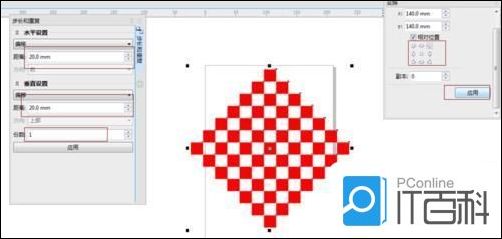 4、将所有全选,变换-->相对位置-->右上;变换-->x:20mm ;-->垂直:20mm;点击【步长和重复】,垂直偏移::20mm;水平偏移:20mm,份数1份-->运用。然后按CTRL+D,直到成一个正方形的效果就可以了。