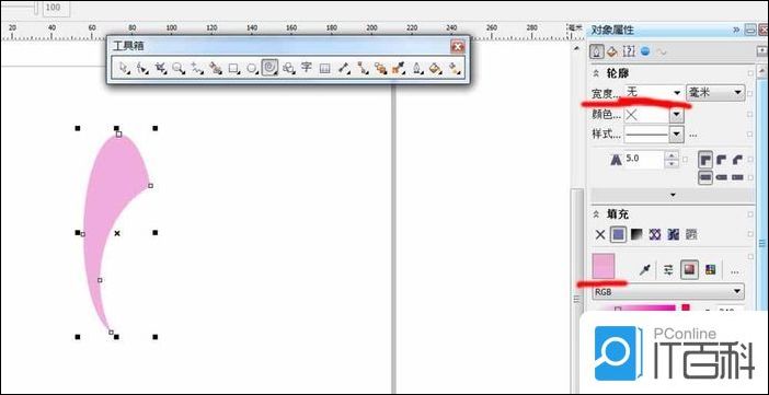4、对图像单击右键→对象属性。在属性栏中的轮廓宽度中选择“无”,禁用轮廓。然后在下面的均匀填充里选择自己想要的颜色,进行图形填充。