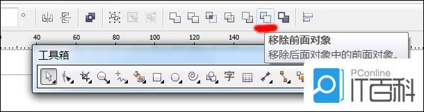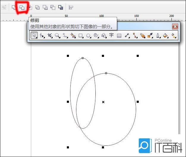 3、同时选中这两个椭圆图形后,单击属性栏中的“后减前”按钮对图形进行计算;也可以使用修剪工具,点击之后,delete删除不要的部分。