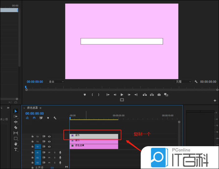 3、选中视频轨道2的矩形图形,在按住alt键来进行复制得到一个同样的矩形到视频轨道3.