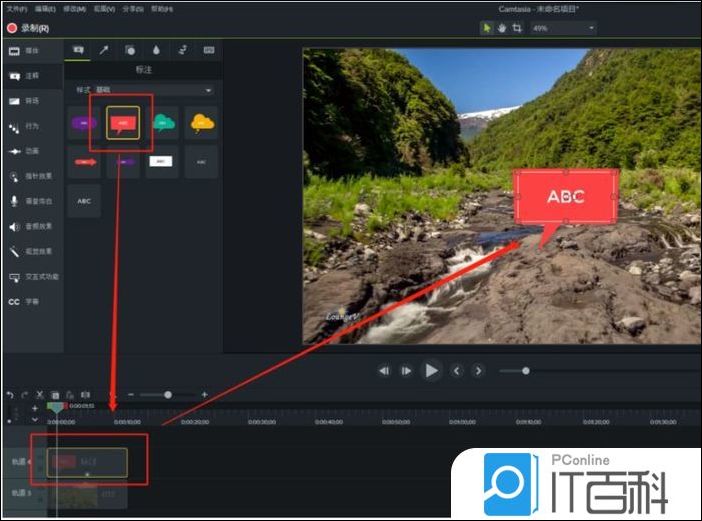 选择一个你喜欢的注释样式,将其拖入时间轴,视频画面上就出现了一个注释样式,