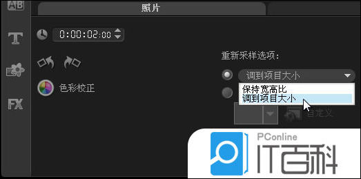 二、展开选项面板,在“照片”选项卡中设置“区间”参数为2秒,在“重新采样选项”中选择“调到项目大小”选项。