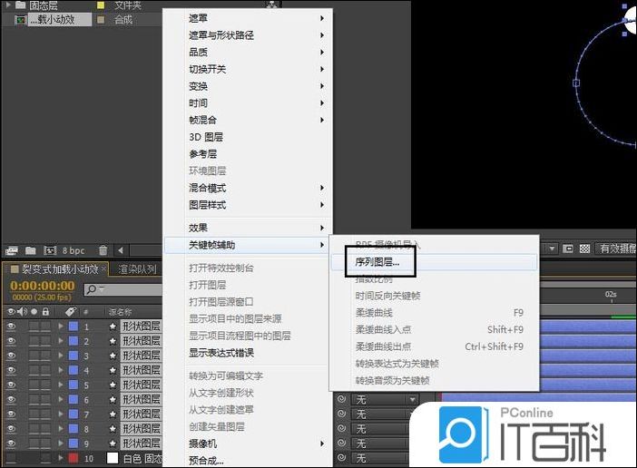 5、选中9个形状图层,右击 关键帧辅助 ,选择系列图层,选择时间点, 每个图层间隔4帧。