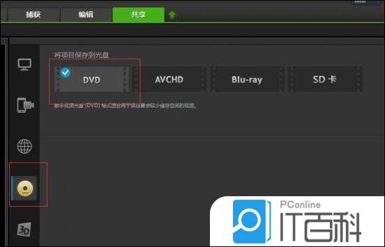2、视频制作完成后,打开共享页面,在软件中间部分的几个选项里选择 光盘样式的图标 , 接下来选择 DVD 。