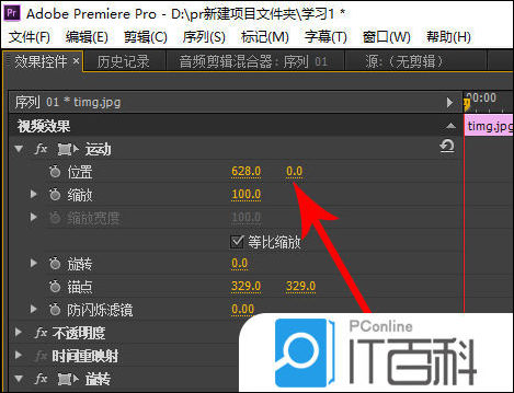 3、在效果控件面板修改位置坐标为(628,0),X轴坐标修改为628,这样图片中心点的位置便会移动至序列右上角位置,位置见下图